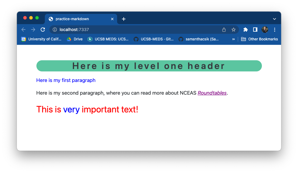 Click Render to render your .qmd file as HTML – it should open in RStudio’s Viewer pane and generate a practice-markdown.html file. Note: Quarto applies the default Bootstrap 5 theme to rendered markdown (giving it a bit of styling as compared to our HTML on the previous slide).