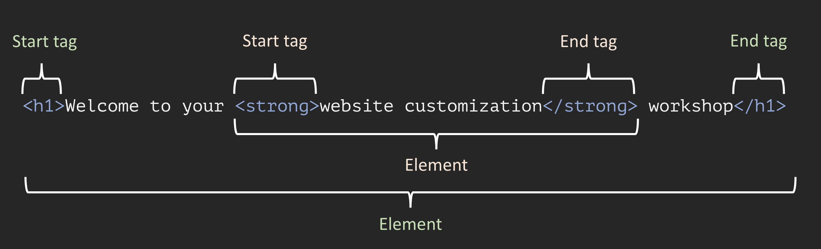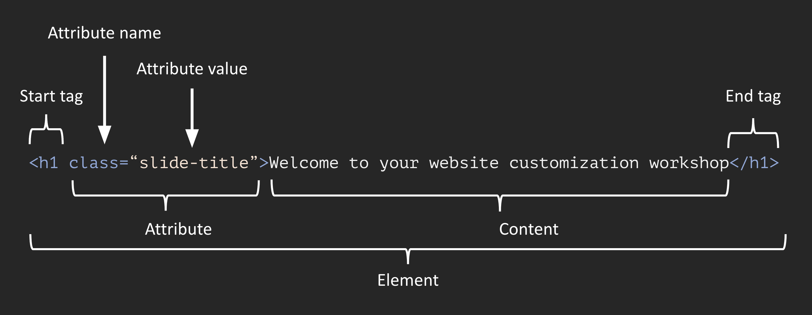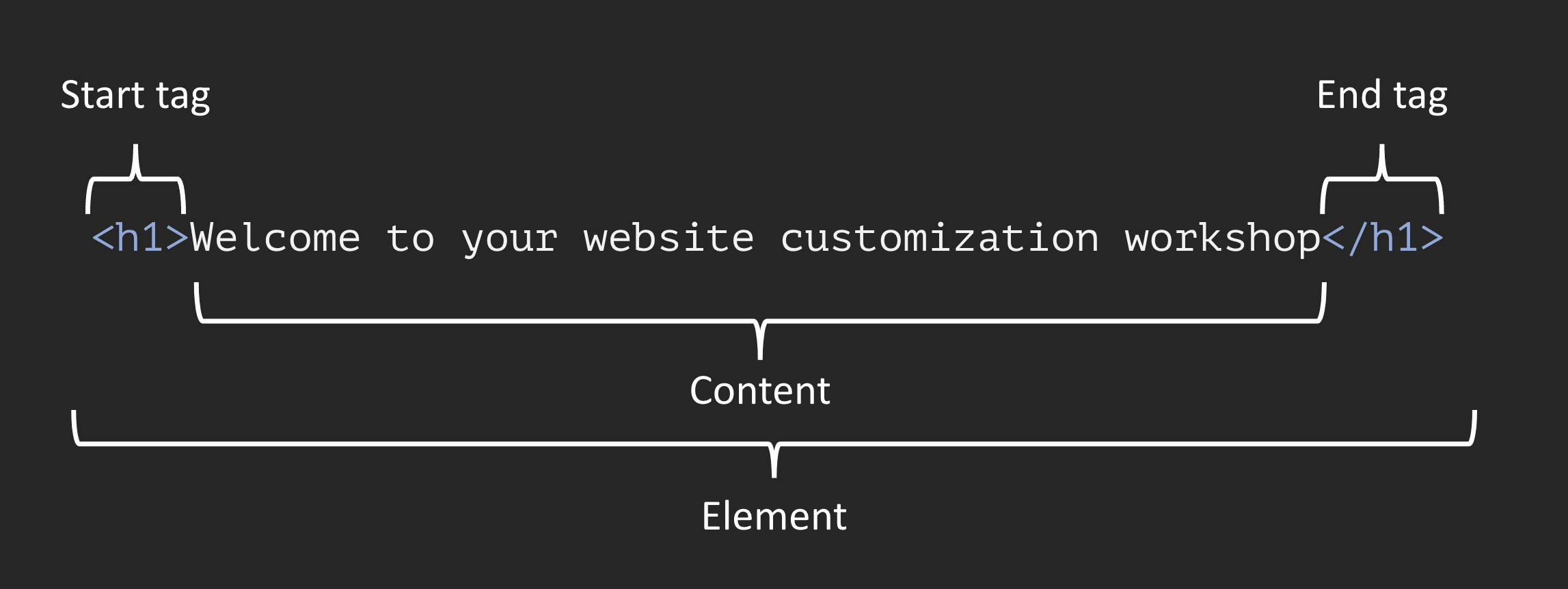 In Markdown syntax, this HTML element would be written as: # Welcome to your website customization workshop